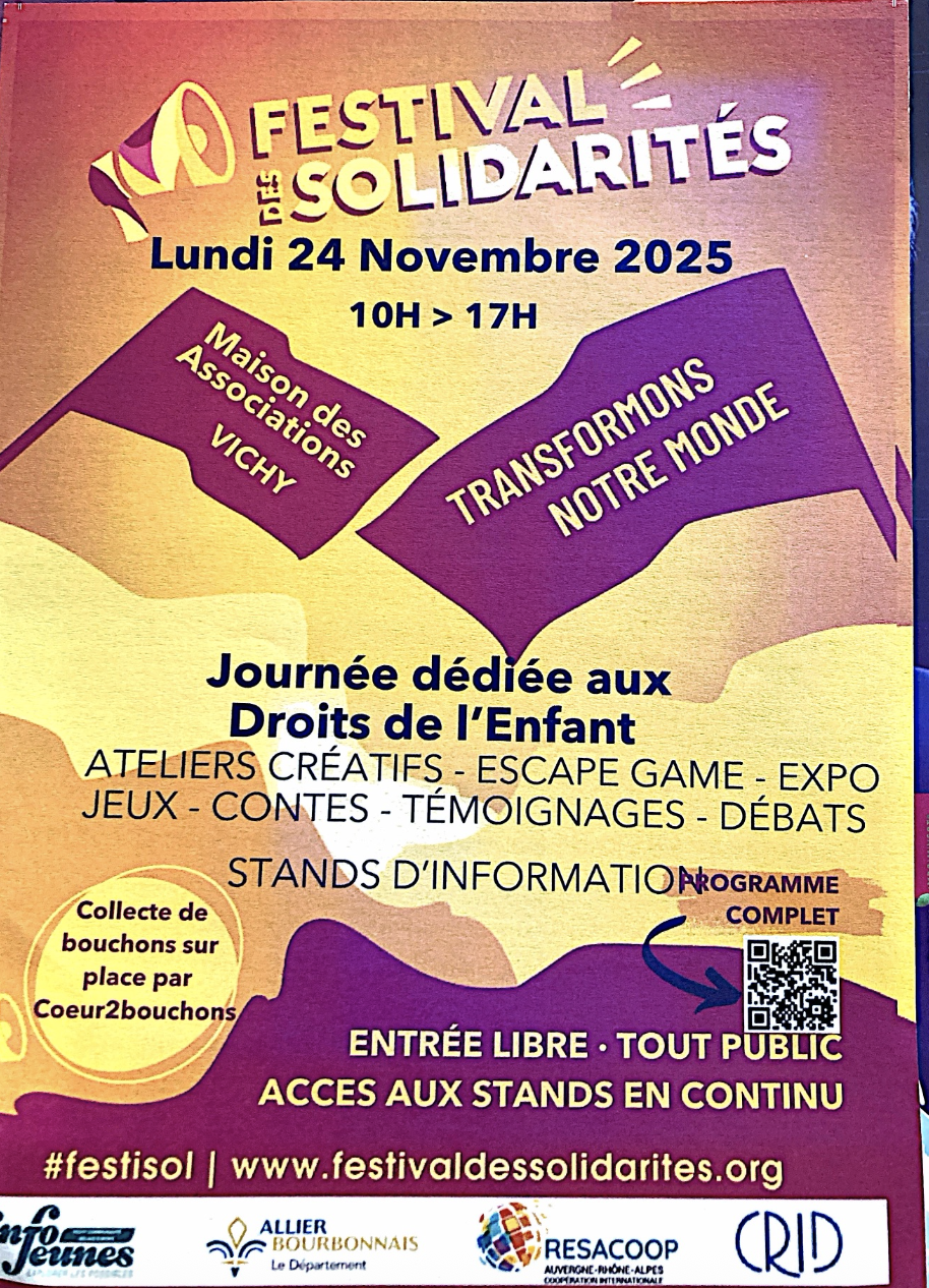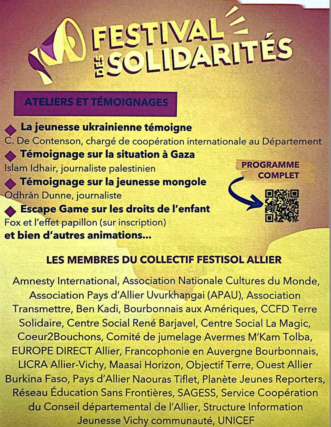 Le lundi 24 novembre, Gannat accueillera une nouvelle édition du Festival des Solidarités, un temps fort dédié à l’ouverture au monde, à la rencontre et à l’engagement citoyen. Porté par le collectif Festisol Allier, cet événement rassemblera de nombreuses associations locales et internationales autour d’ateliers, de témoignages et d’animations accessibles à tous.